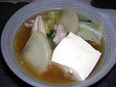 で、これがよそった図。 もつはあんまり見えませんが、豆腐と大根がうまそう。 いや、実際にうまいです。