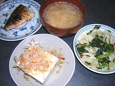 で、いきなりすっ飛んで5月26日。 まあ、ごはんは色々やってましたが、忙しかったんでしょう、きっと。 鯖と冷奴と大根の漬け物でうまー!という図です。 最近肉食から魚食に移行していて、典型的な和食になってます。 これら全てが最近のスタンダードであり、ブームです。 特にいい味噌を買ってから、味噌汁飲みまくってました。 安い味噌はまずい。いいのを味わって初めて判る違いかと。